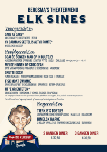 Op slechts 5 autominuten en 10 fietsminuten van ons restaurant speelt tussen 8 en 26 oktober de theatervoorstelling ‘Elk Sines’. Gedurende deze periode kunt u vooraf, of na afloop van de matineevoorstelling al vanaf € 32,50 per persoon bij ons terecht voor het heerlijke theatermenu ‘Elk Sines’.