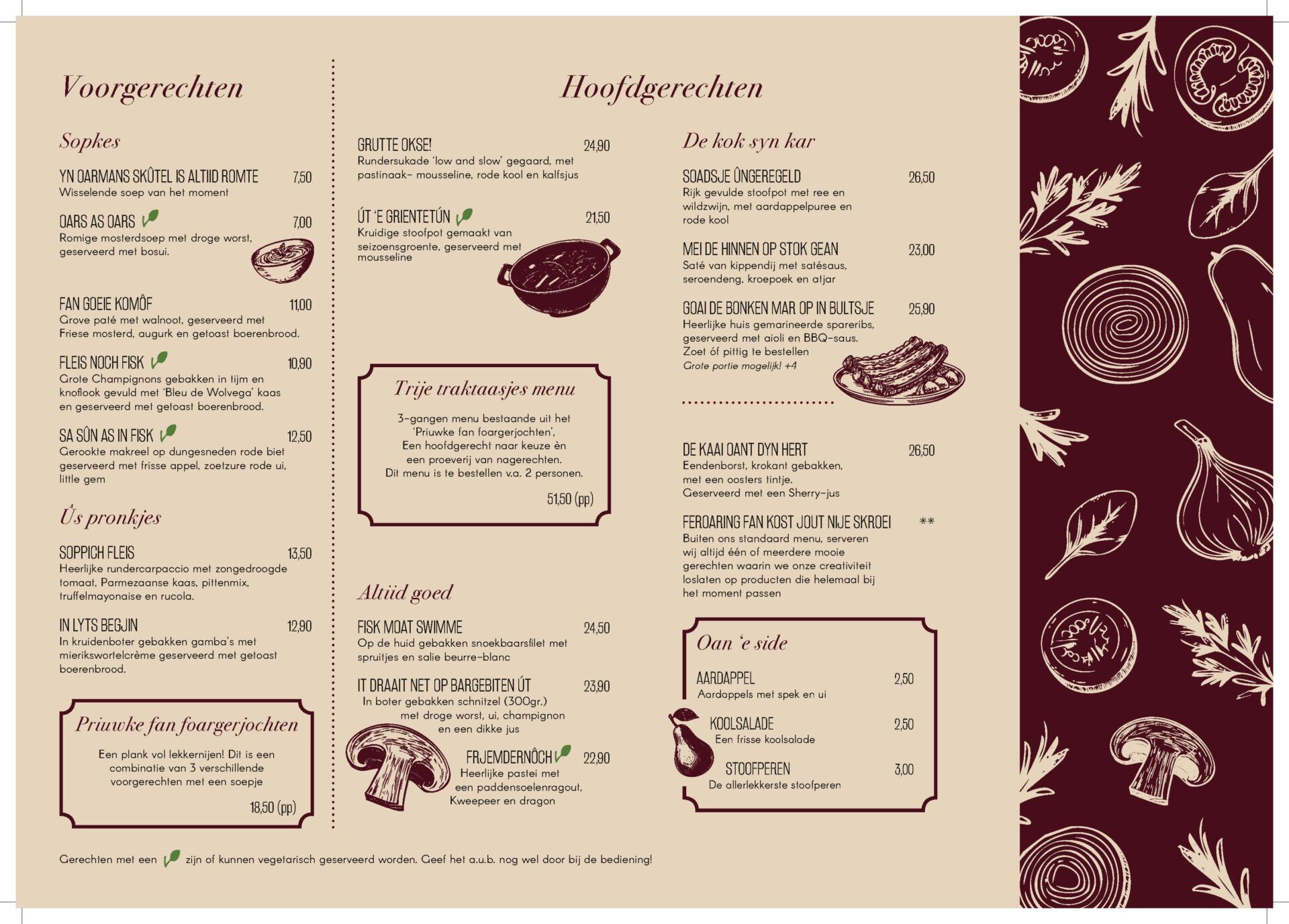 In overleg met u en uw gezelschap stellen we het menu samen. Om u alvast op gang te helpen hebben we hieronder een aantal voorbeelden uitgeschreven. In overleg kunnen gerechten worden aangepast, dan krijgt u een offerte op maat.